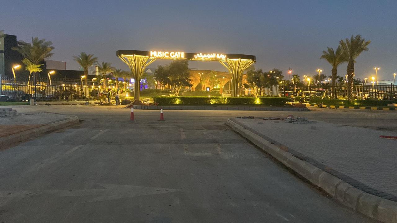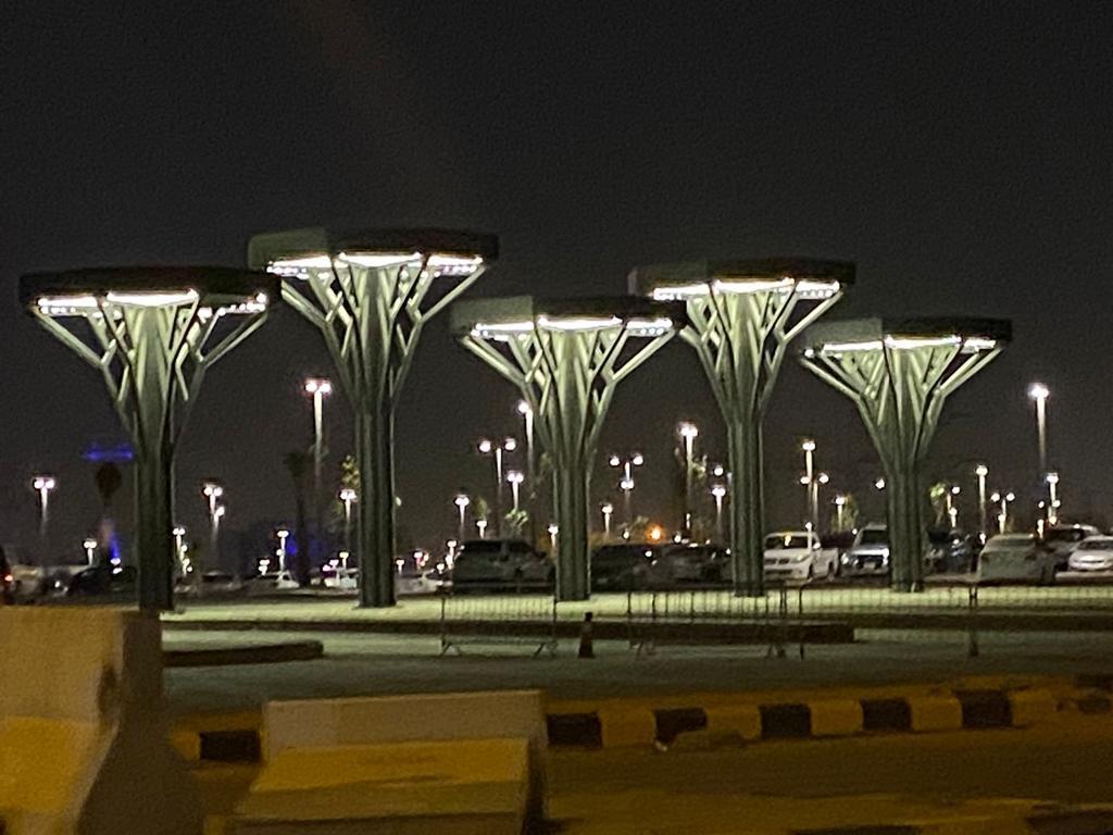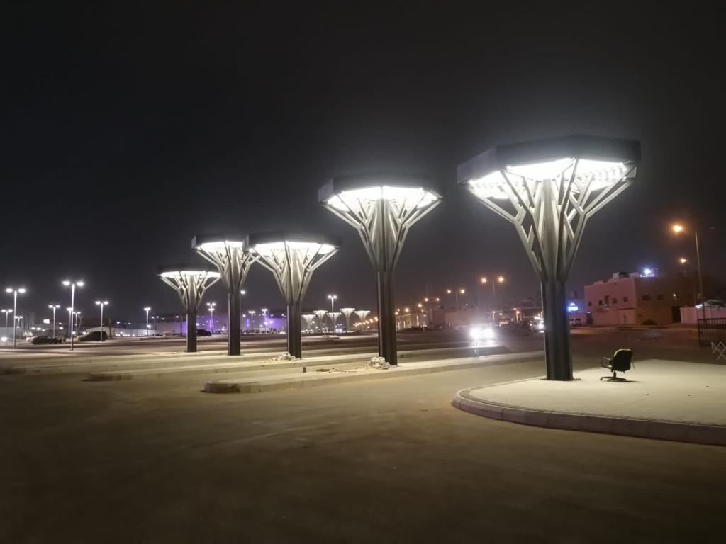 Two types of gates for the car parking space and the main halls spaces and a signage column with 12 m height and a 7 m double cantilever